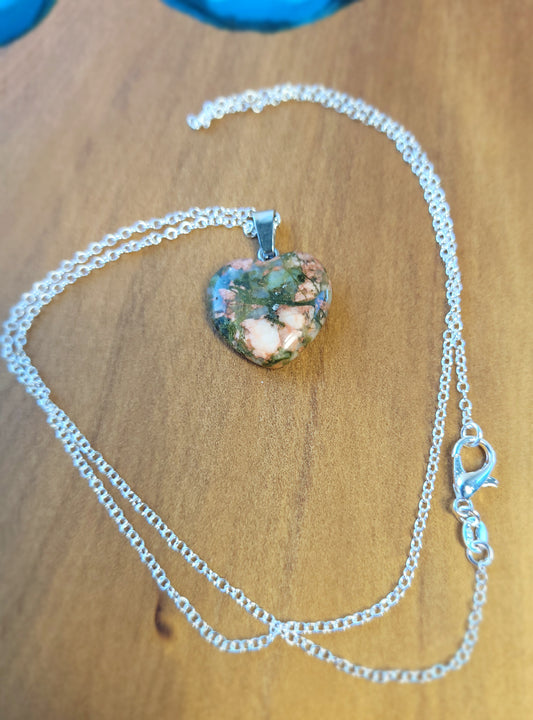 Green Orange & Cream Unakite Heart crystal & silver chain necklace