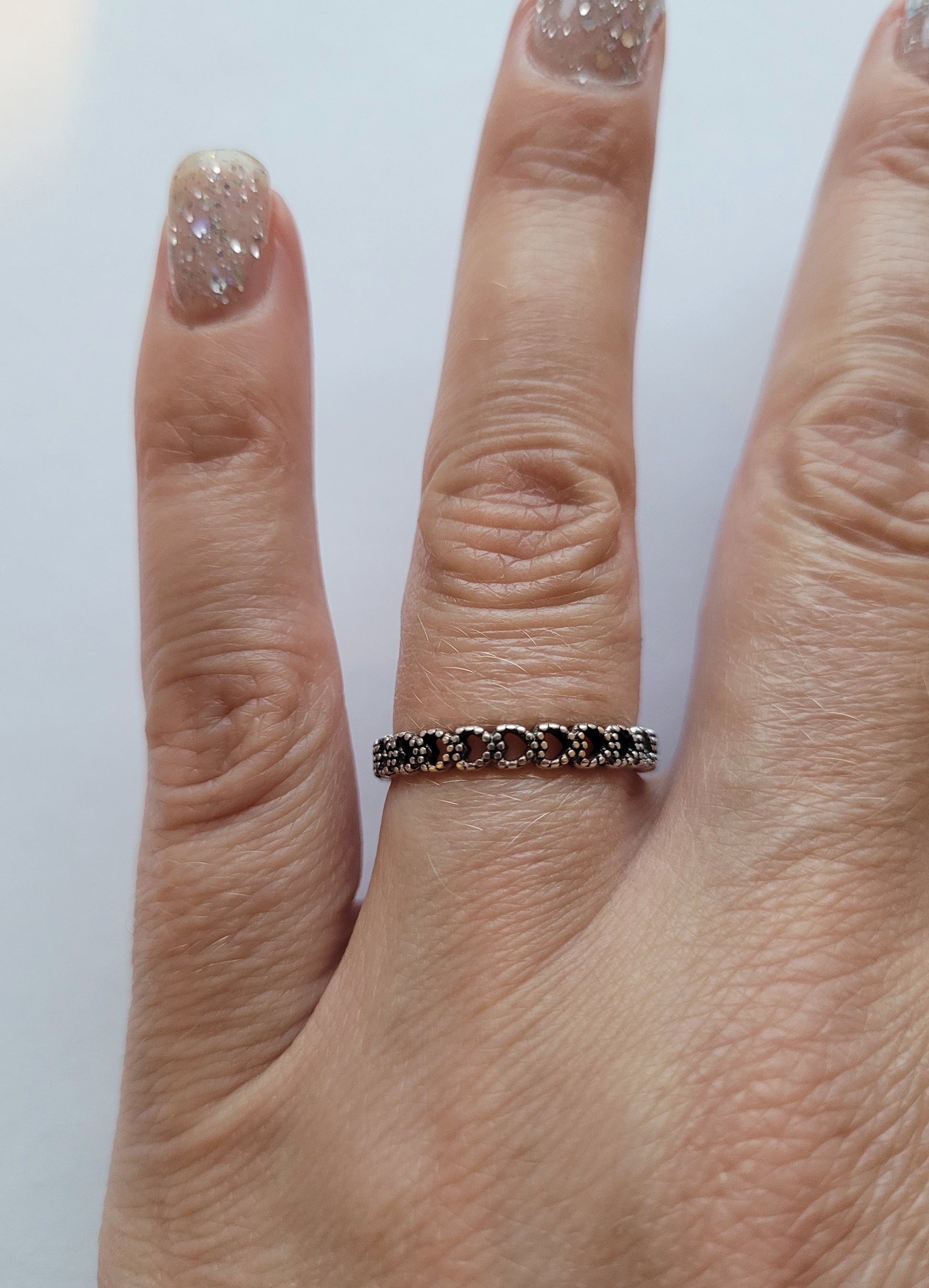 Crafted with precision in sterling silver, this ring showcases an intricate openwork design, featuring a band adorned with a series of delicately crafted hearts and intricate bead detailing. Every detail is carefully hand-finished to ensure a piece of exceptional quality and beauty.