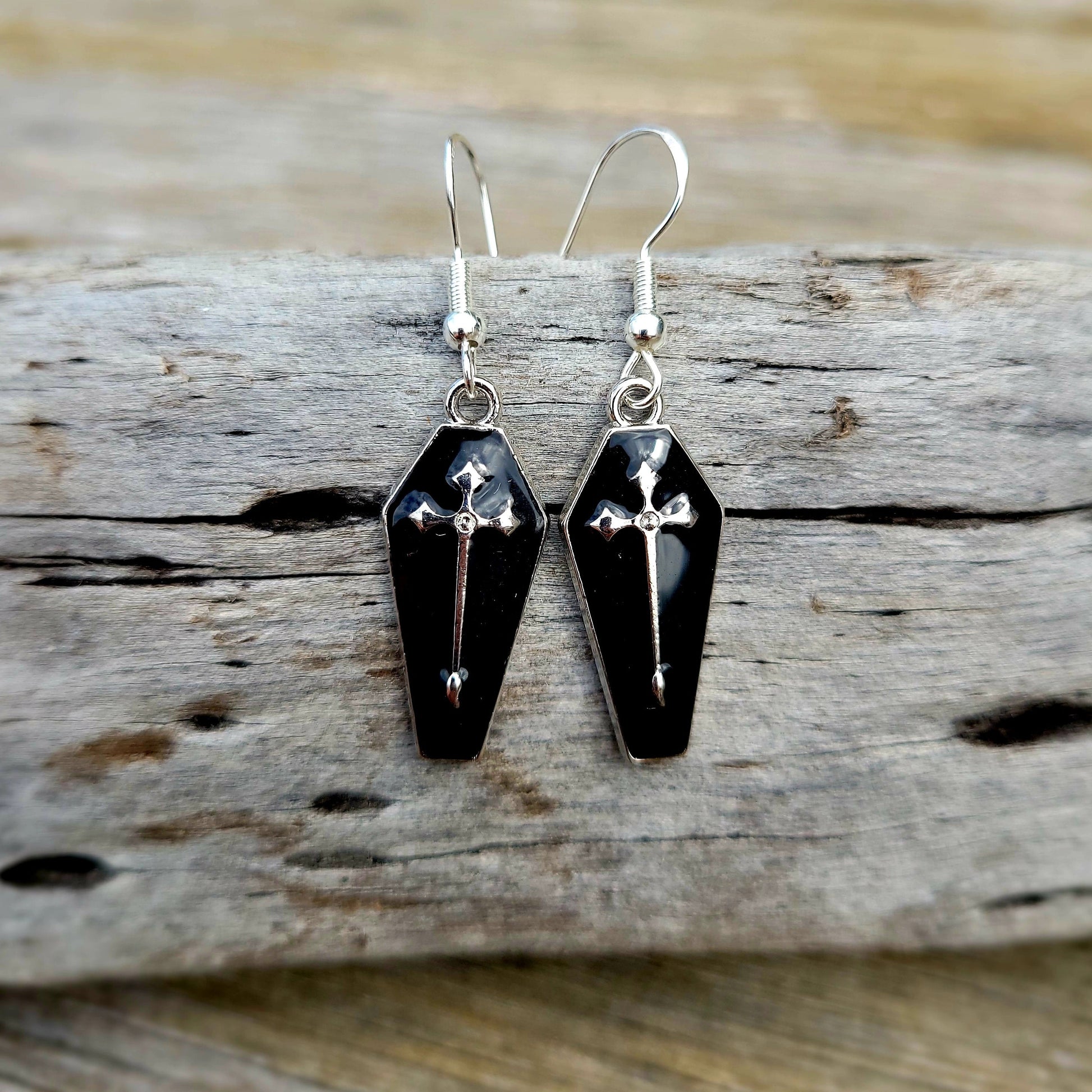 These unique earrings feature a enamel coffin with a silver cross design, creating a gothic and emo look.