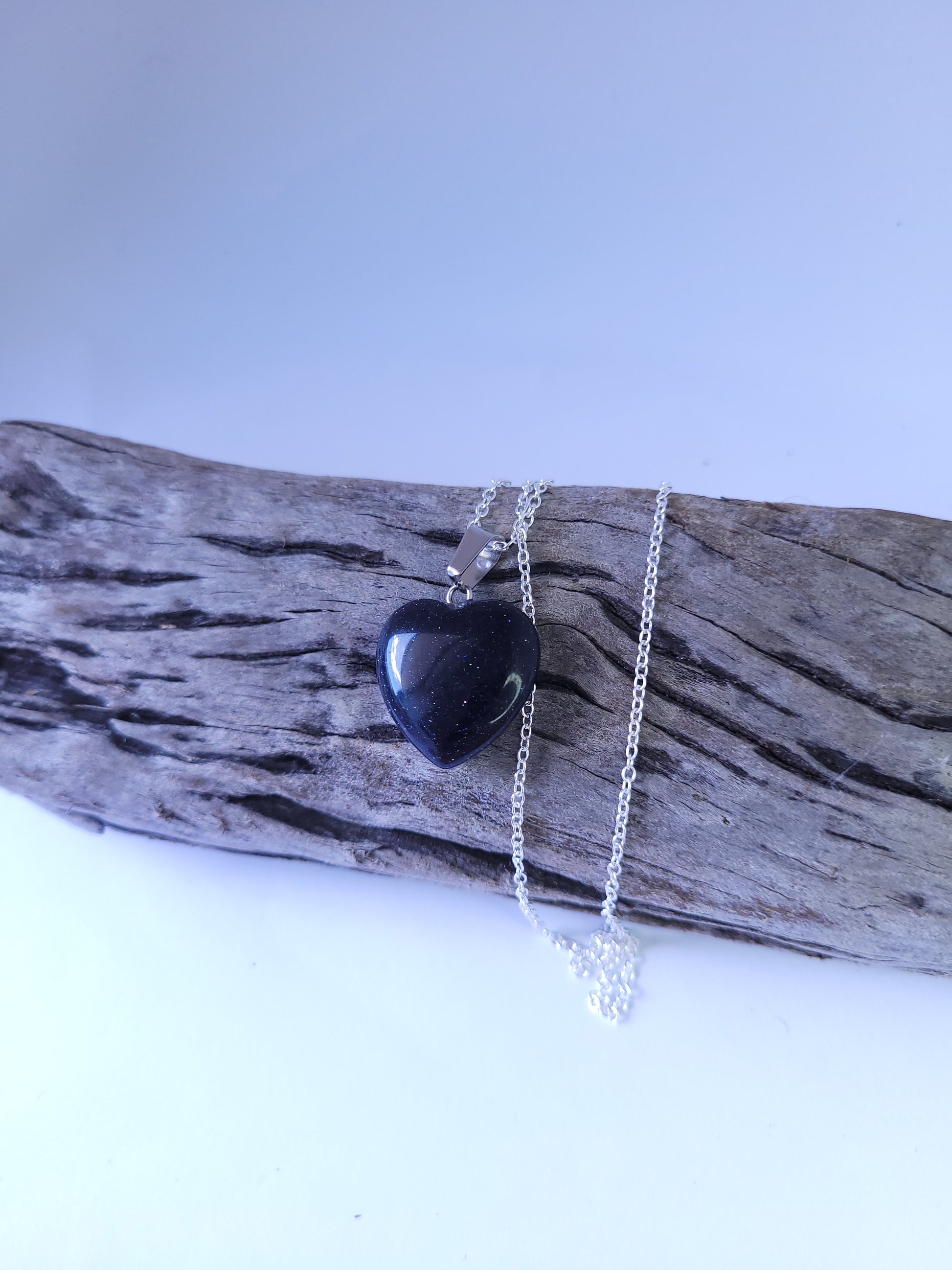 Crafted from Blue goldstone, this heart-shaped pendant exudes a mesmerizing sparkle. The pendant is paired with a high-quality sterling silver chain, ensuring both durability and style.