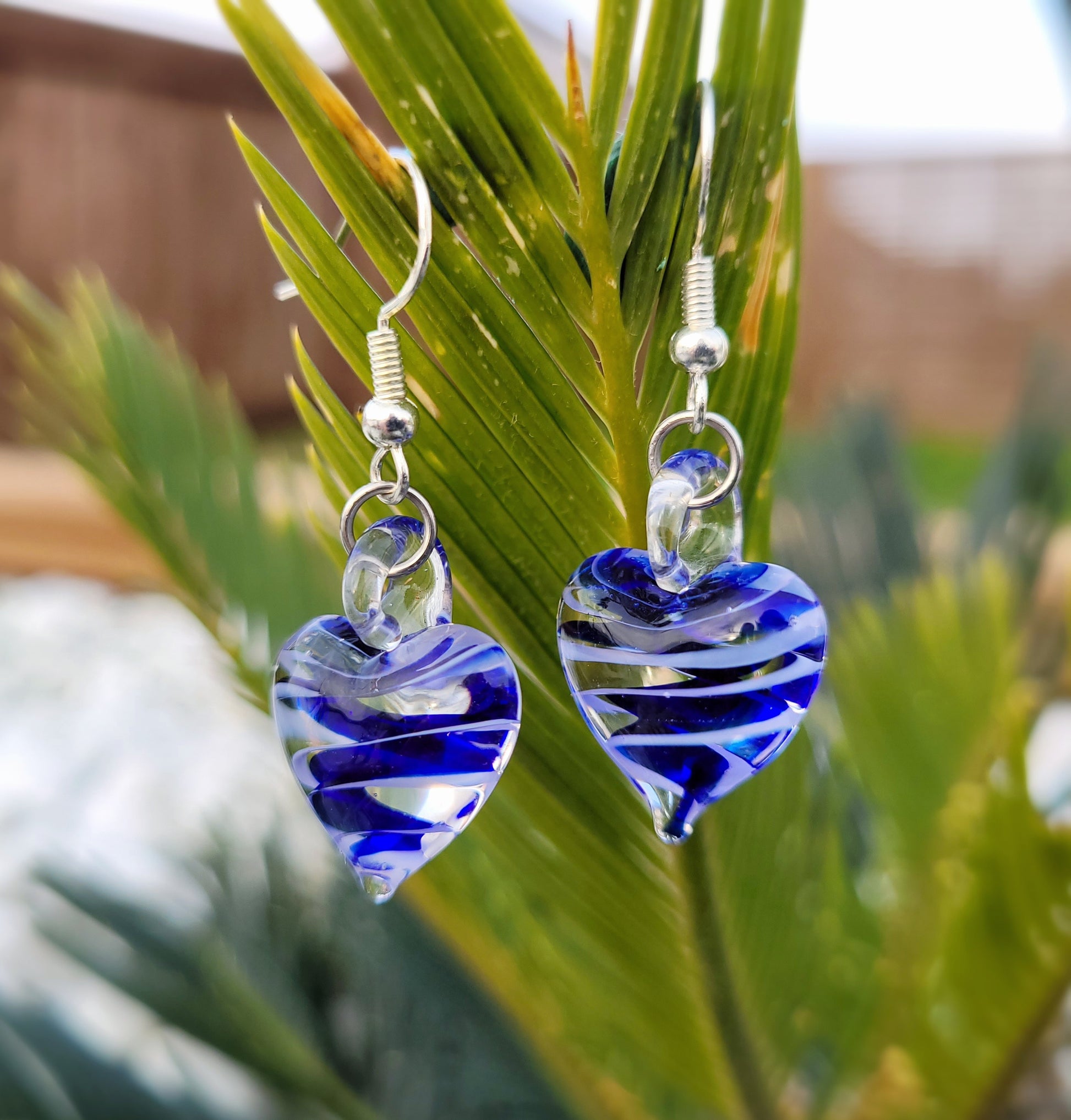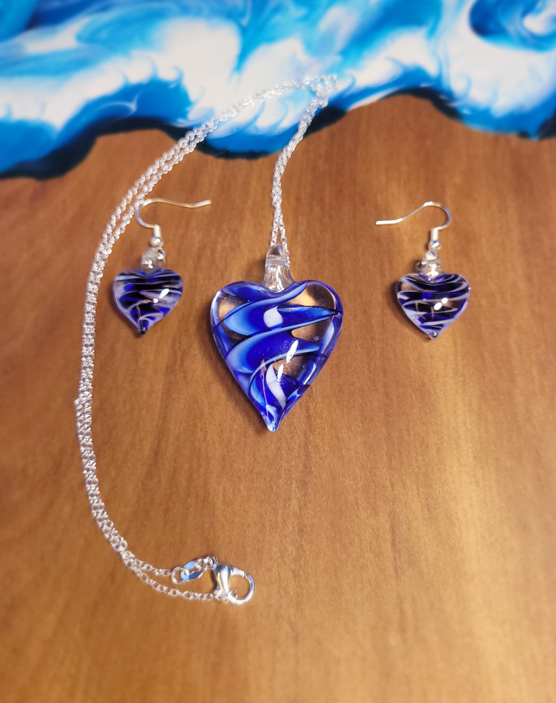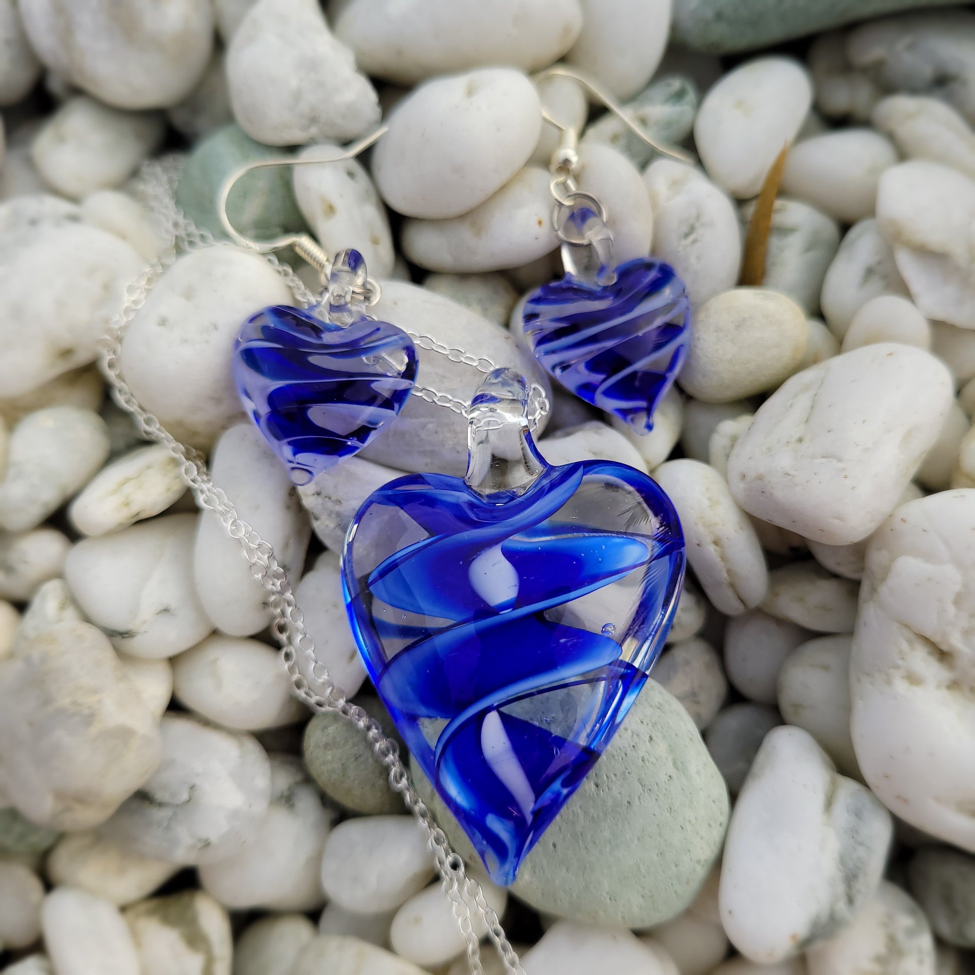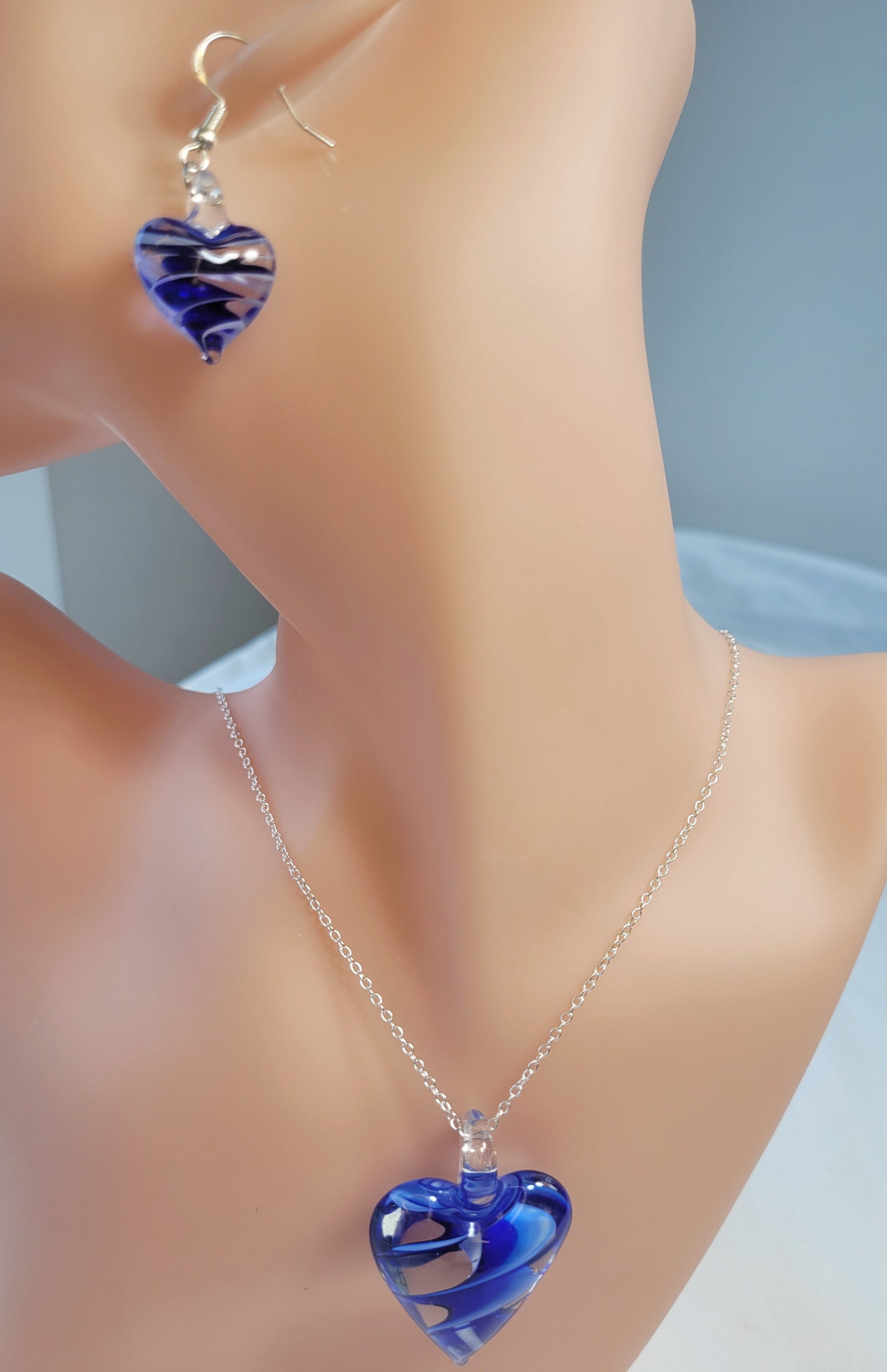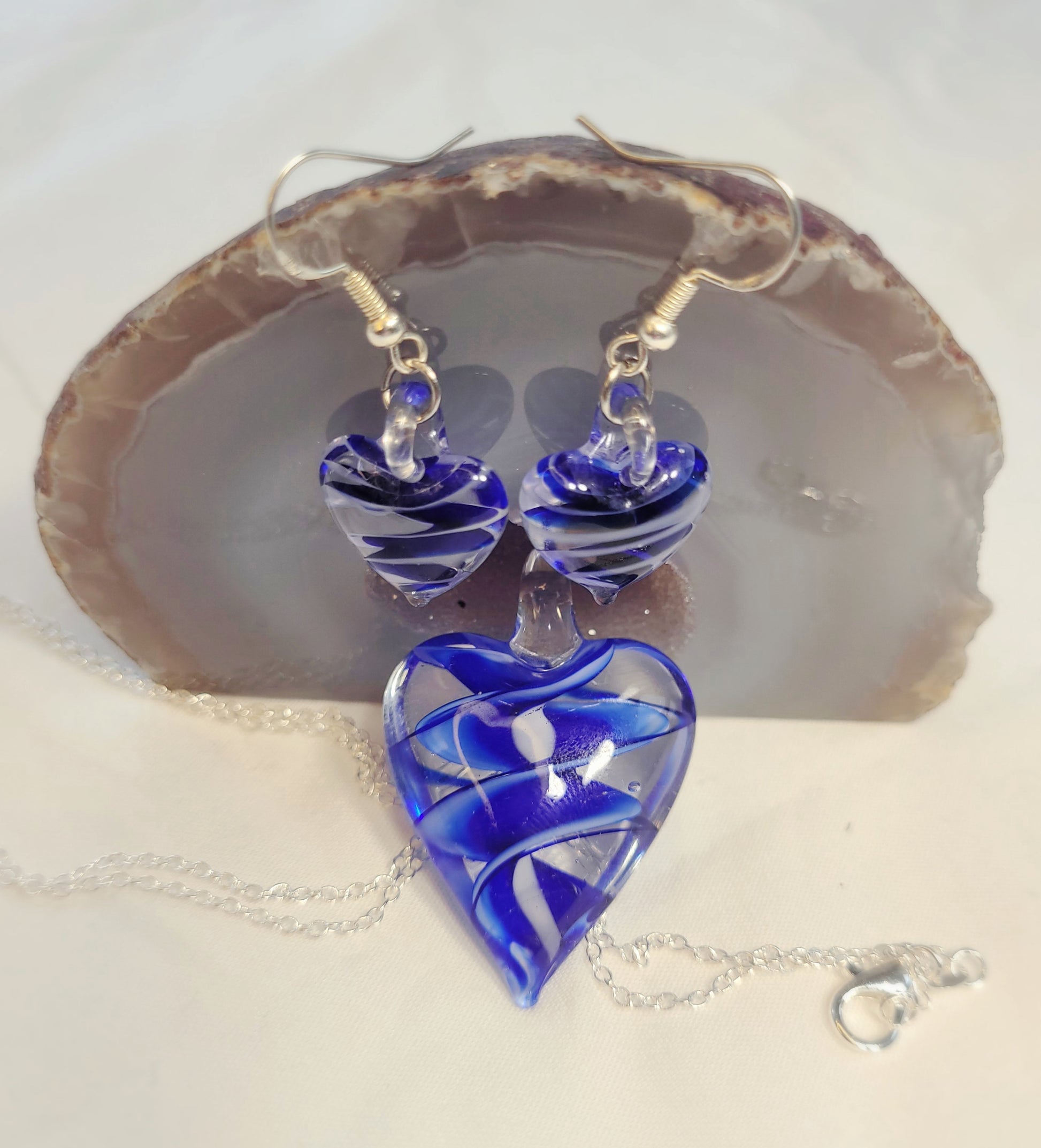 Introducing our stunning Blue Heart Glass Necklace and Earrings Set, a perfect combination of elegance and style. This set features beautiful blue glass pendants suspended on a sterling silver chain, accompanied by matching earrings with stainless steel hooks.