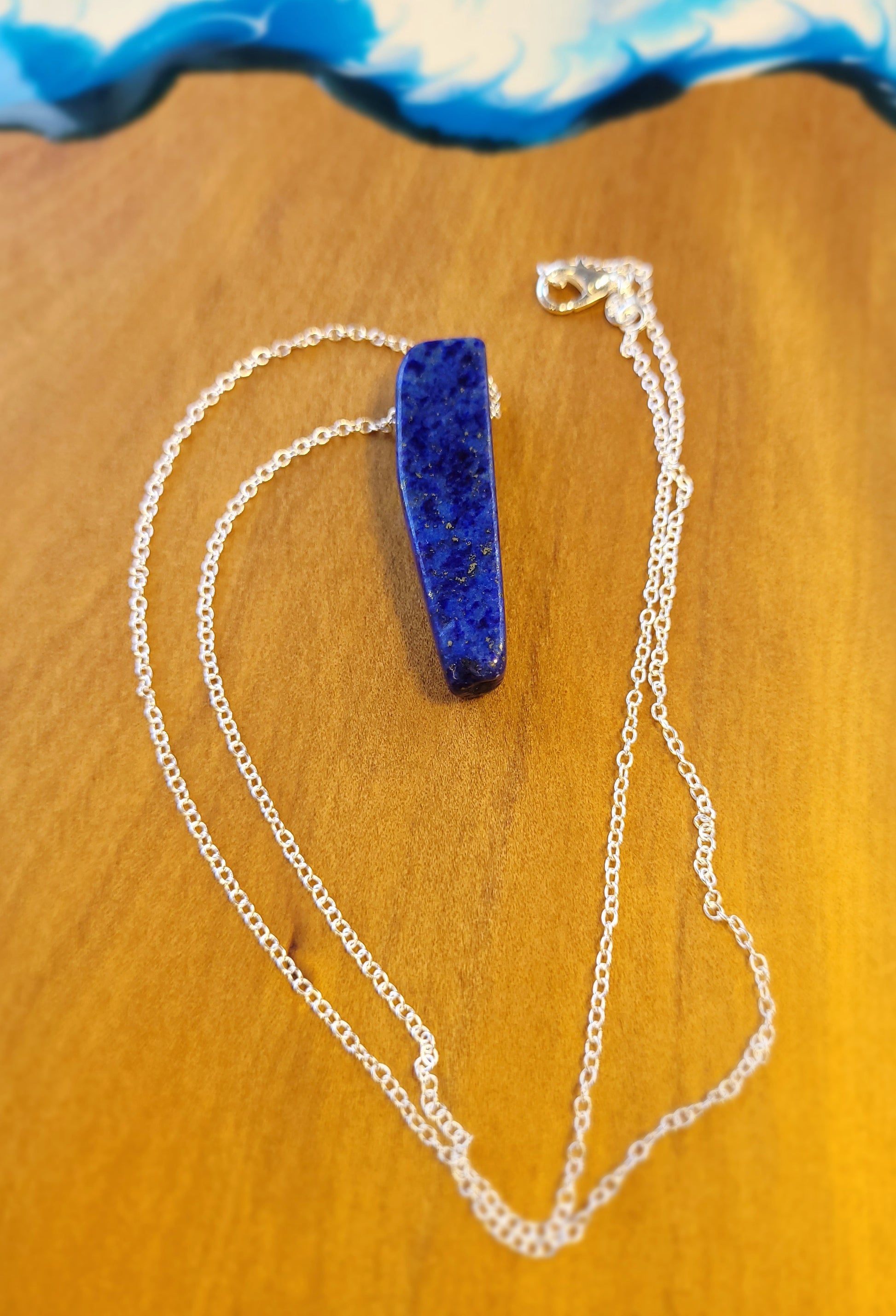 This necklace features a stunning slice of Lapis Lazuli, carefully crafted and suspended on a sterling silver chain. The mesmerizing blue hues of the Lapis Lazuli create a captivating focal point, with the slice measuring approximately 40mm long, 10mm wide, and 7mm deep.