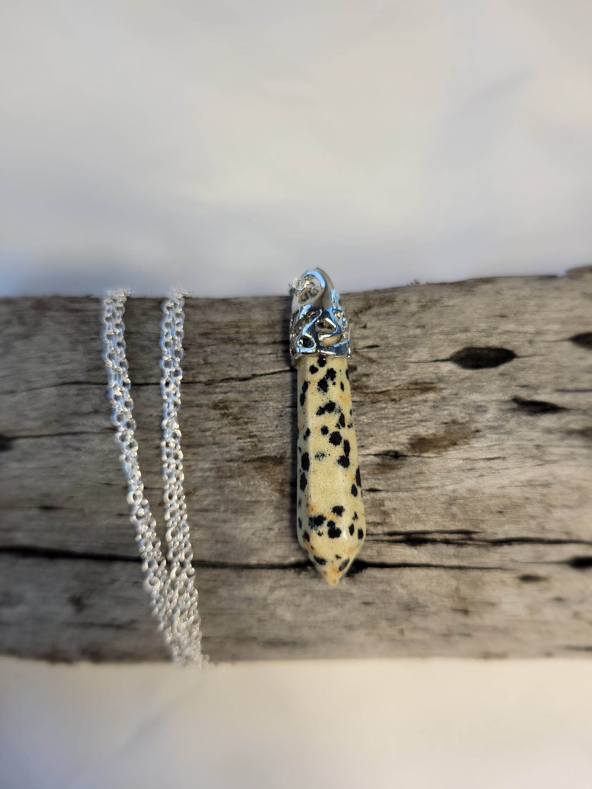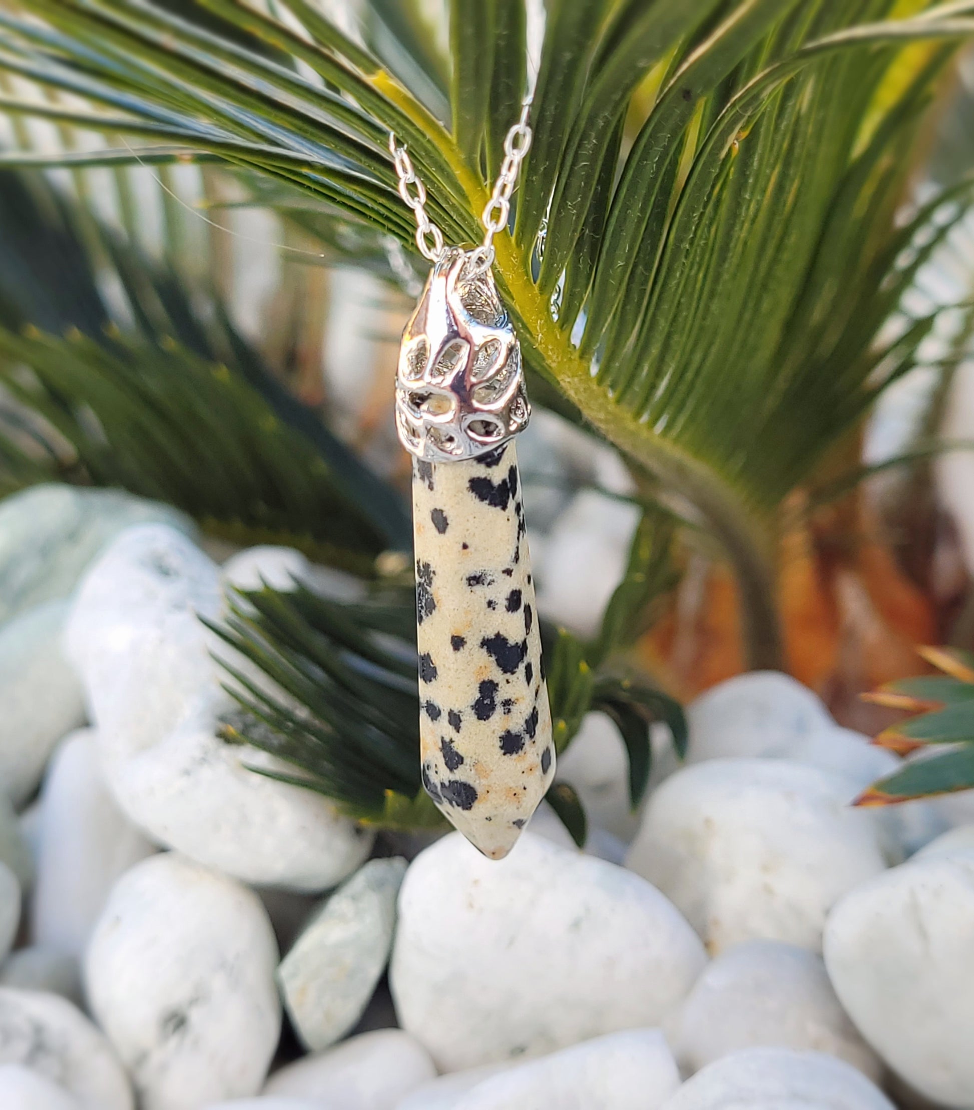 Crafted with care, the pendant features a natural Dalmatian Jasper gemstone that is beautifully complemented by the sterling silver chain. The pendant hangs delicately, creating a captivating focal point. With its neutral tones and distinctive spotted patterns, Dalmatian Jasper is known for its grounding and protective properties, making it a perfect choice for day-to-day wear.