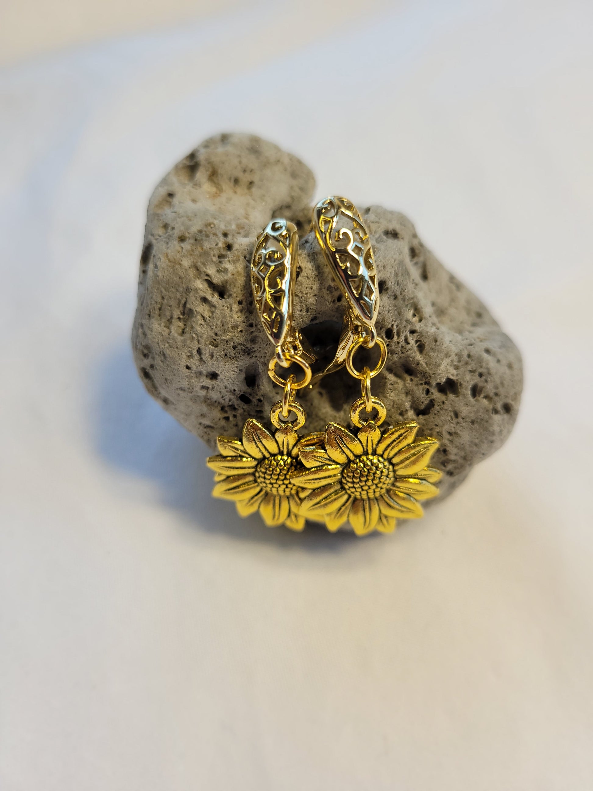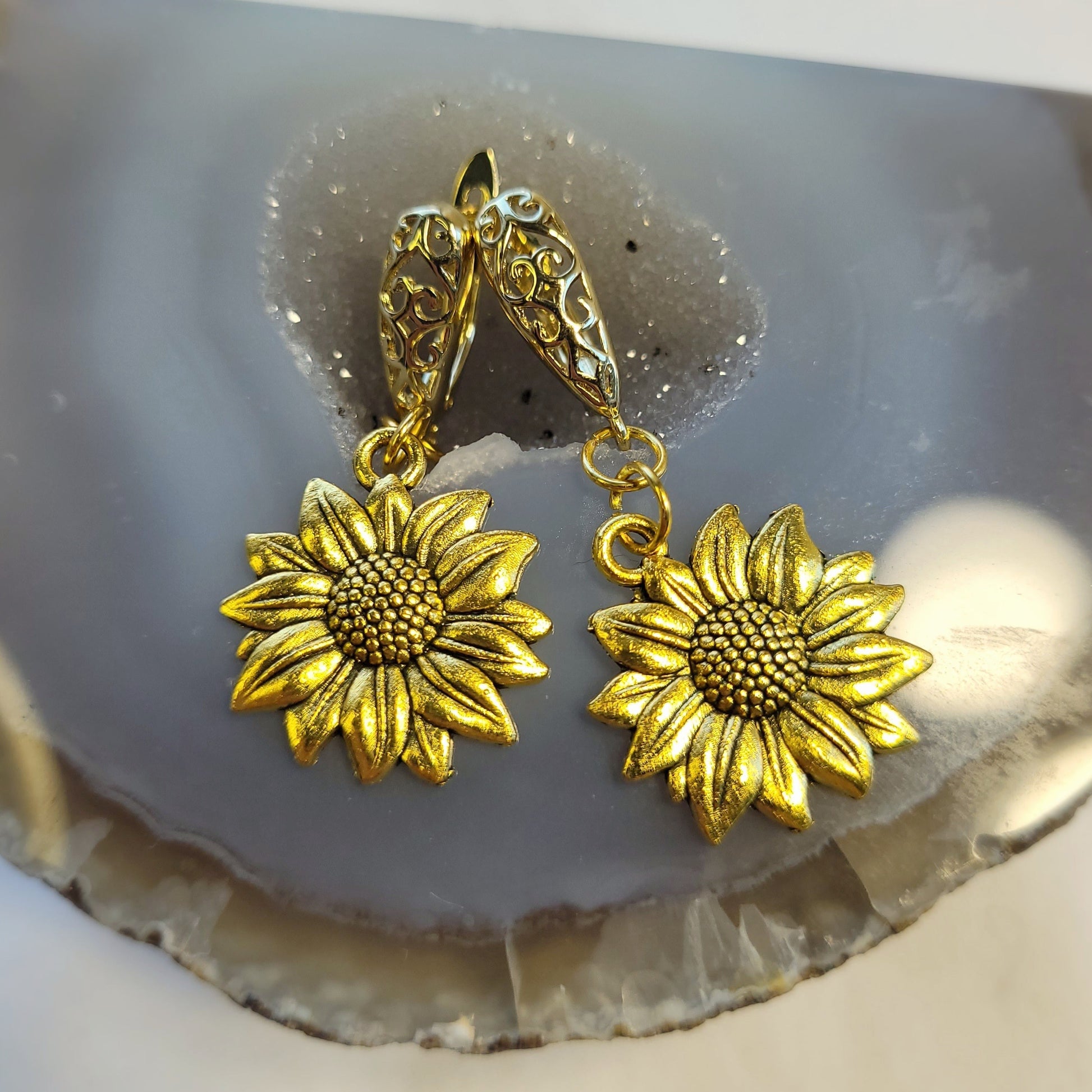 These earrings feature intricate filigree detailing in the shape of sunflowers, capturing the essence of boho, retro, and funky styles. Their unique design adds a touch of elegance and whimsy to any outfit.