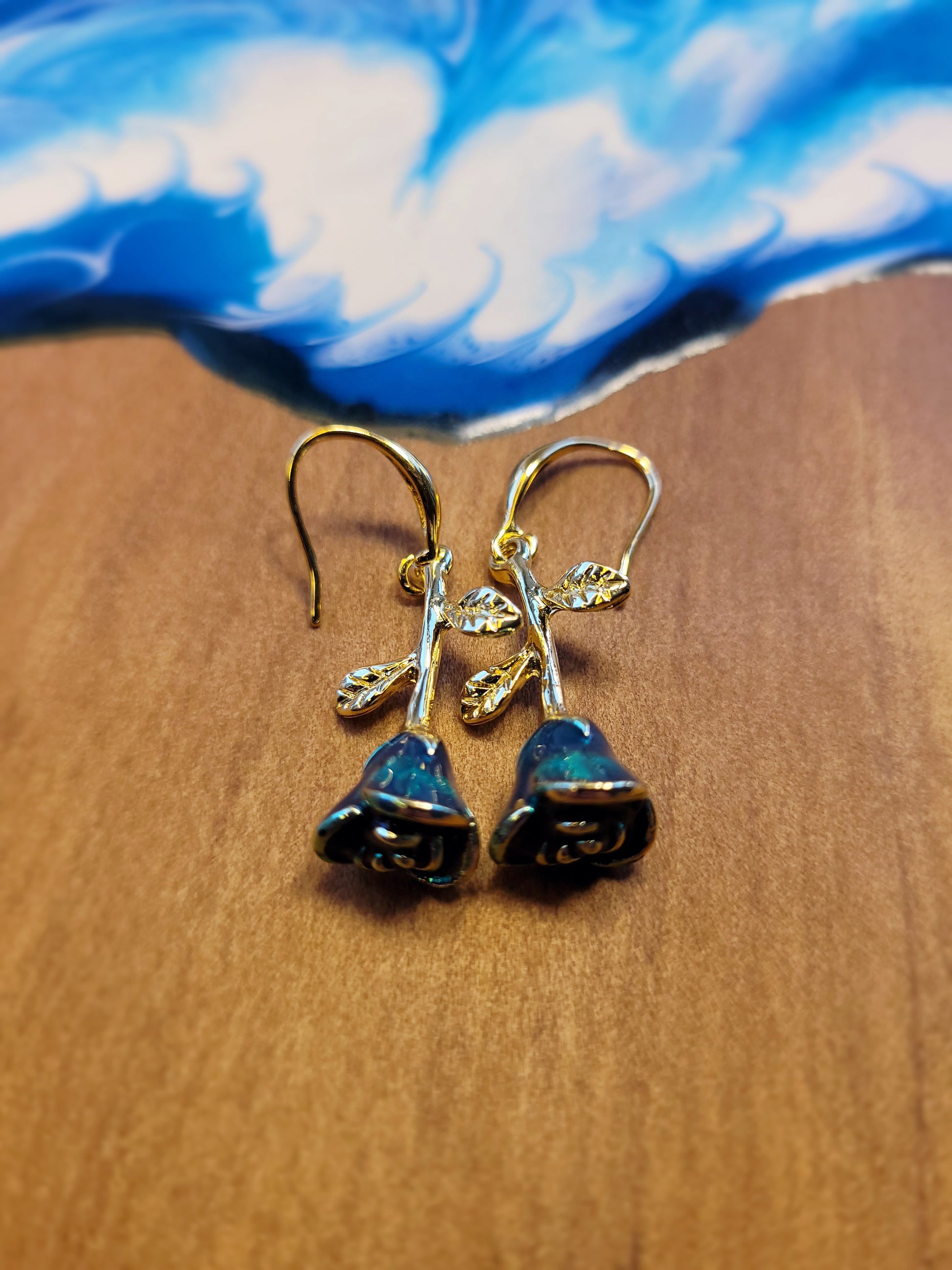 Discover the beauty of these exquisite earrings, featuring intricate gold and green rose designs with a charming gold-colored accent and hook. Elevate your style with the timeless elegance of these unique and beautifully crafted pieces. Shop now to adorn yourself with the enchanting allure of our Gold & Green Roses Earrings.