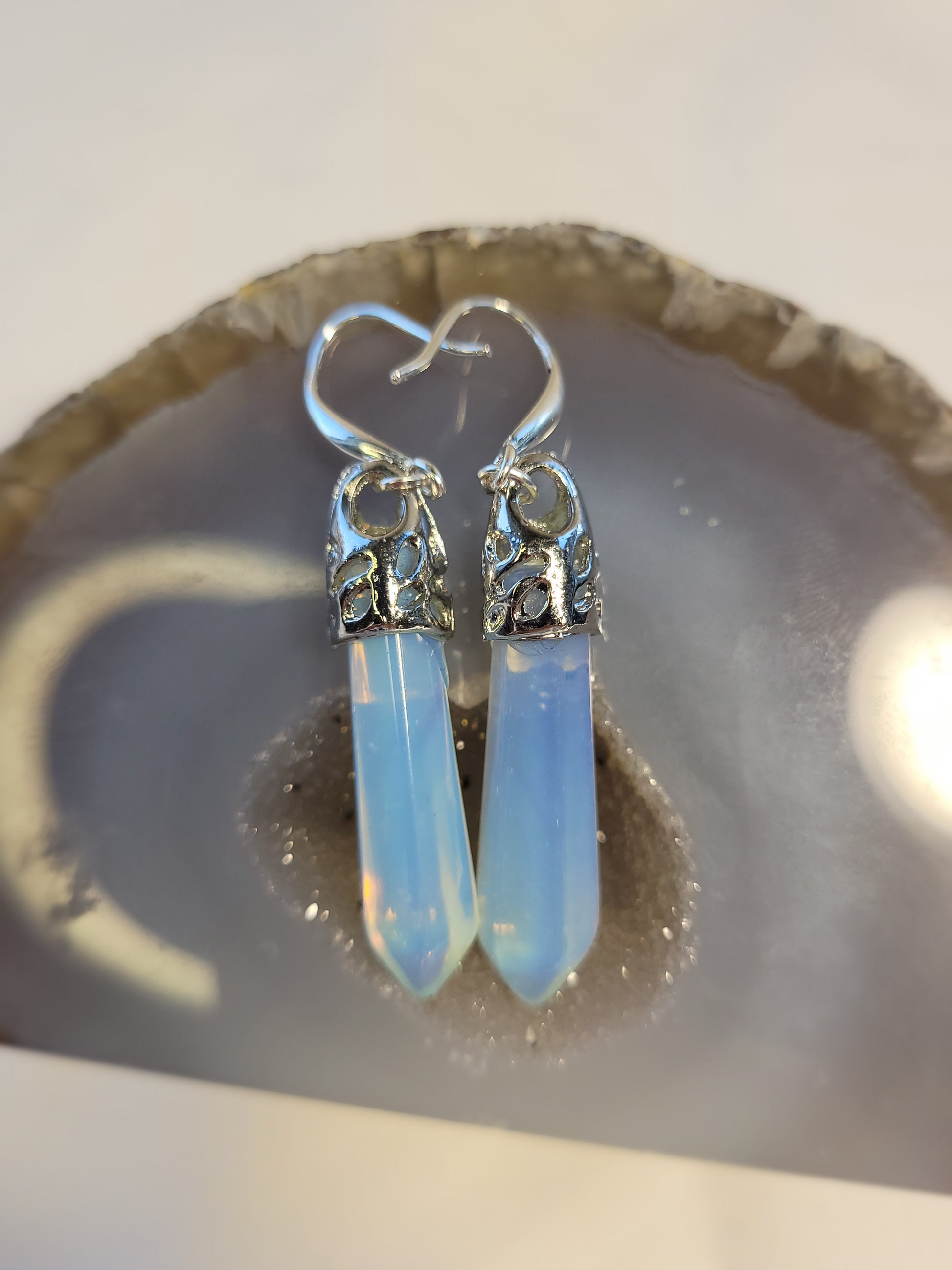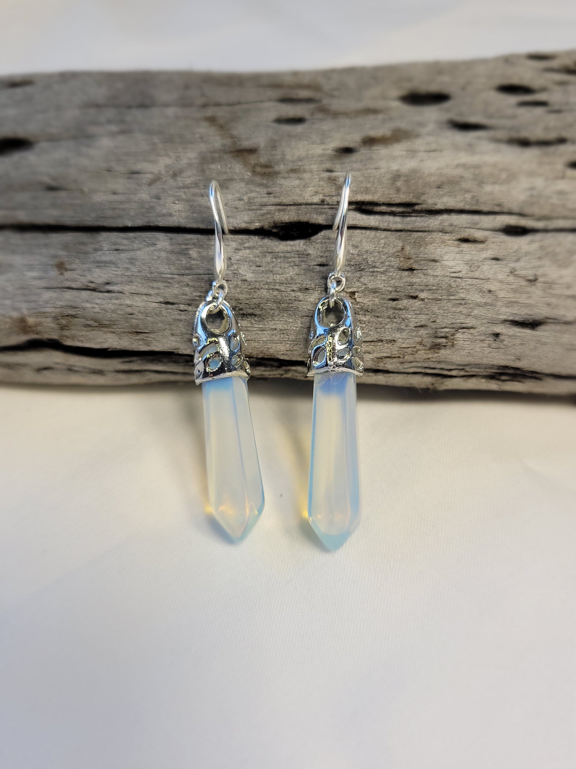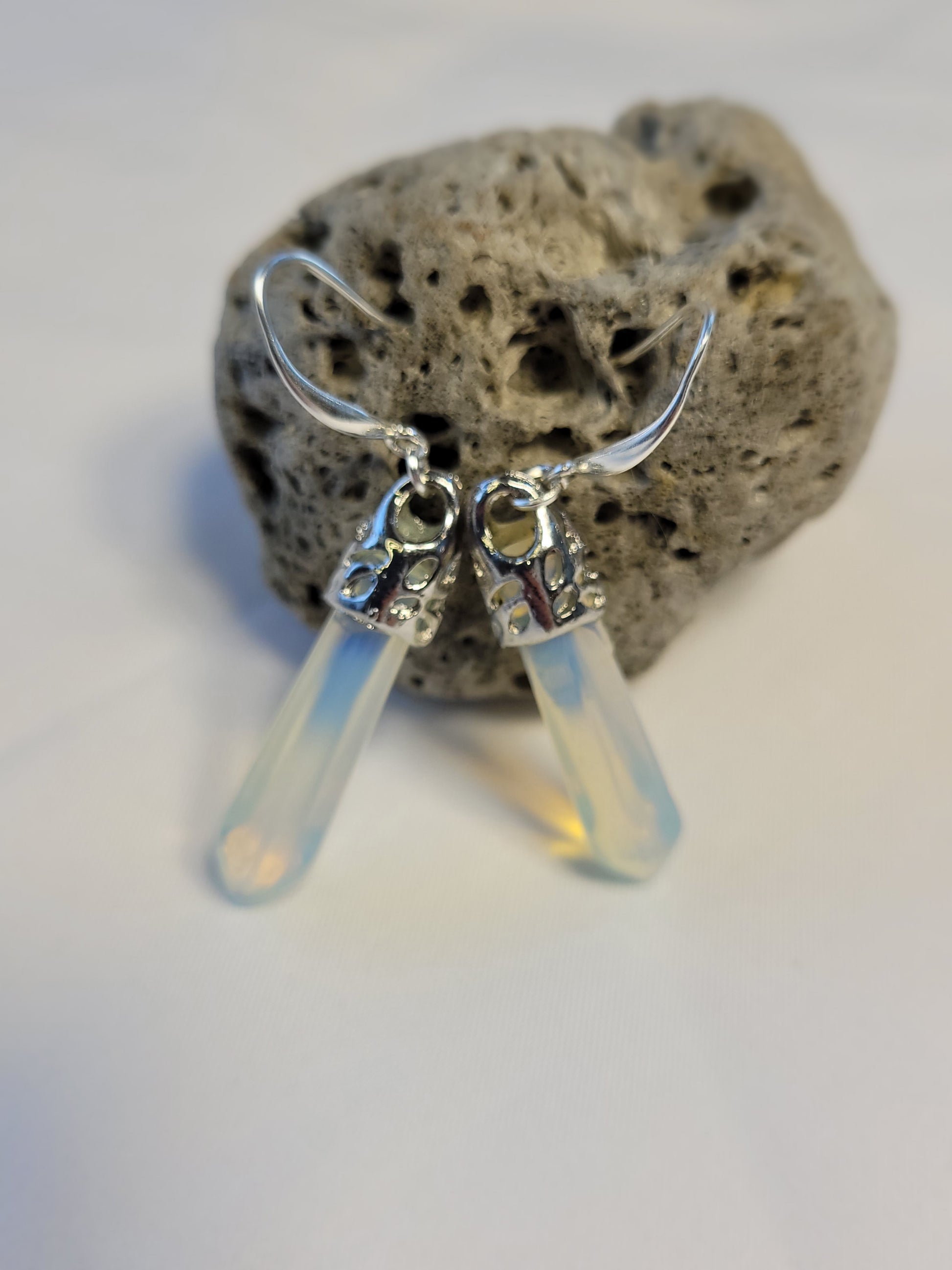 Discover the enchantment of these stunning earrings, showcasing the mesmerizing beauty of Moonstone Opalite. Each earring features a captivating Moonstone pendant elegantly crafted in sterling silver, symbolizing inner clarity, cyclical change, and a profound connection to the feminine energy.