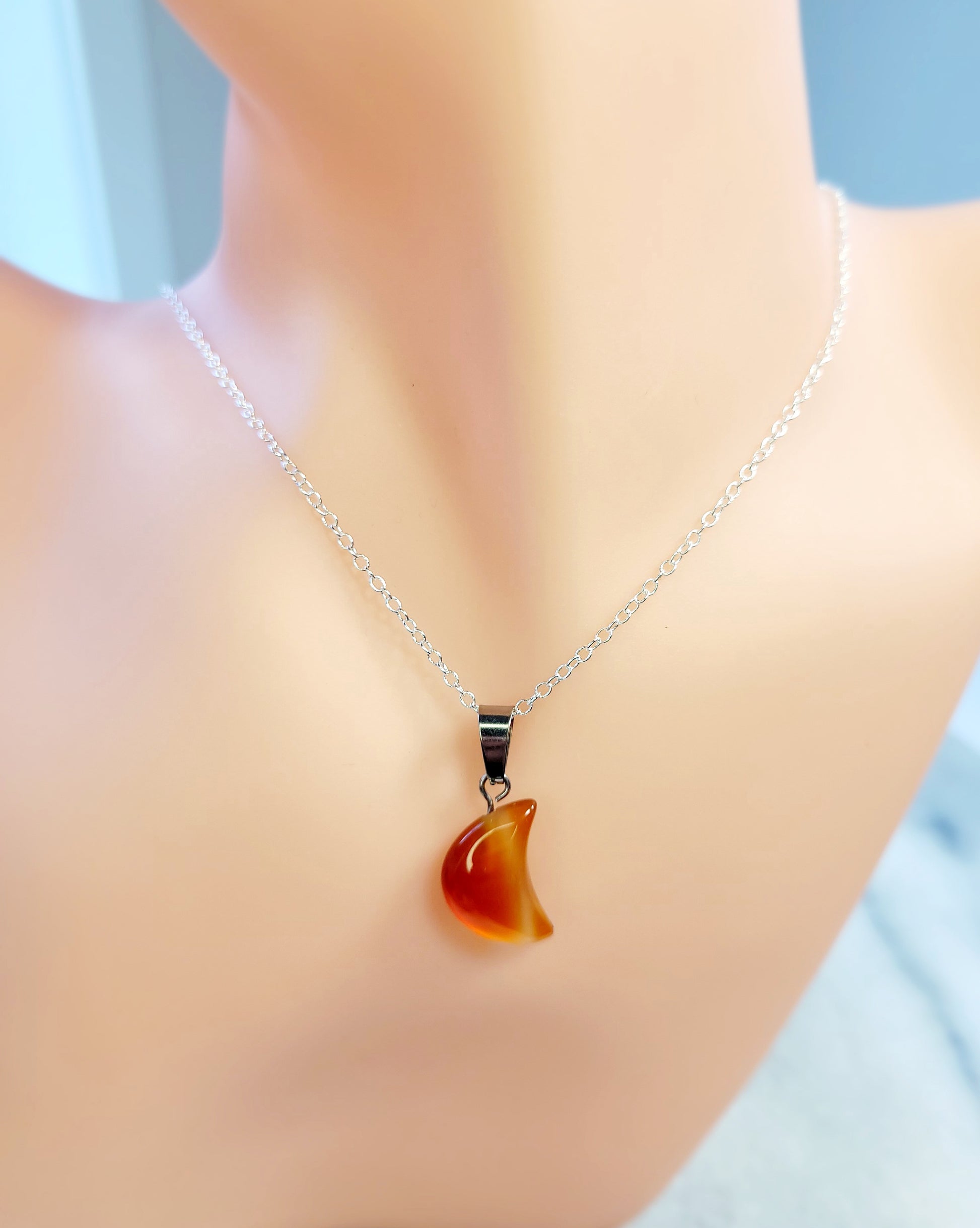 Looking for a unique and stunning crystal necklace to elevate your day-to-day look? Look no further than our Natural Red Onyx Quarter Moon pendant necklace, featuring a sterling silver chain. This exquisite necklace is perfect for adding a touch of elegance and sophistication to your style.
