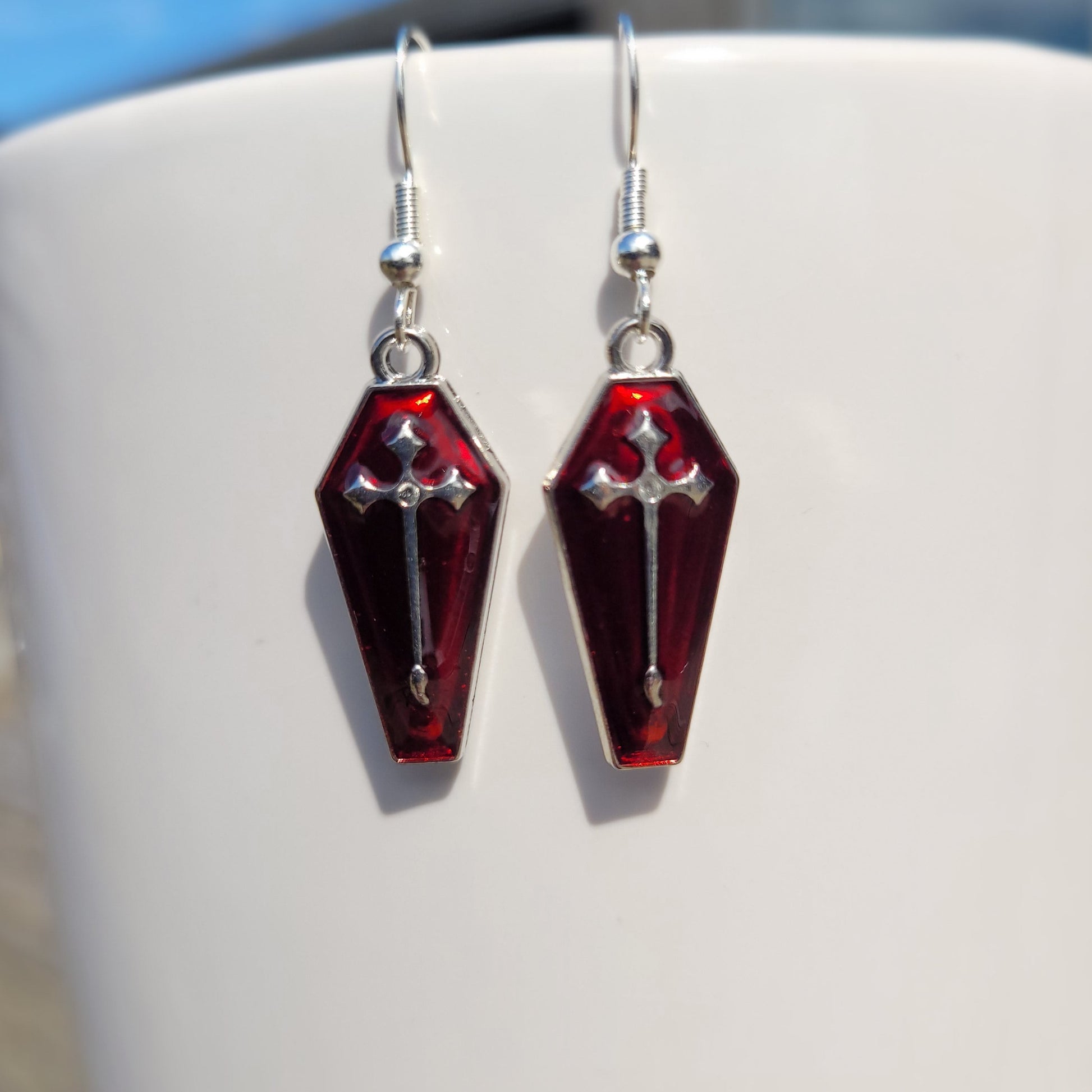 Introducing our stunning new Red Silver Cross Enamel Coffin Earrings, perfect for Halloween and beyond.