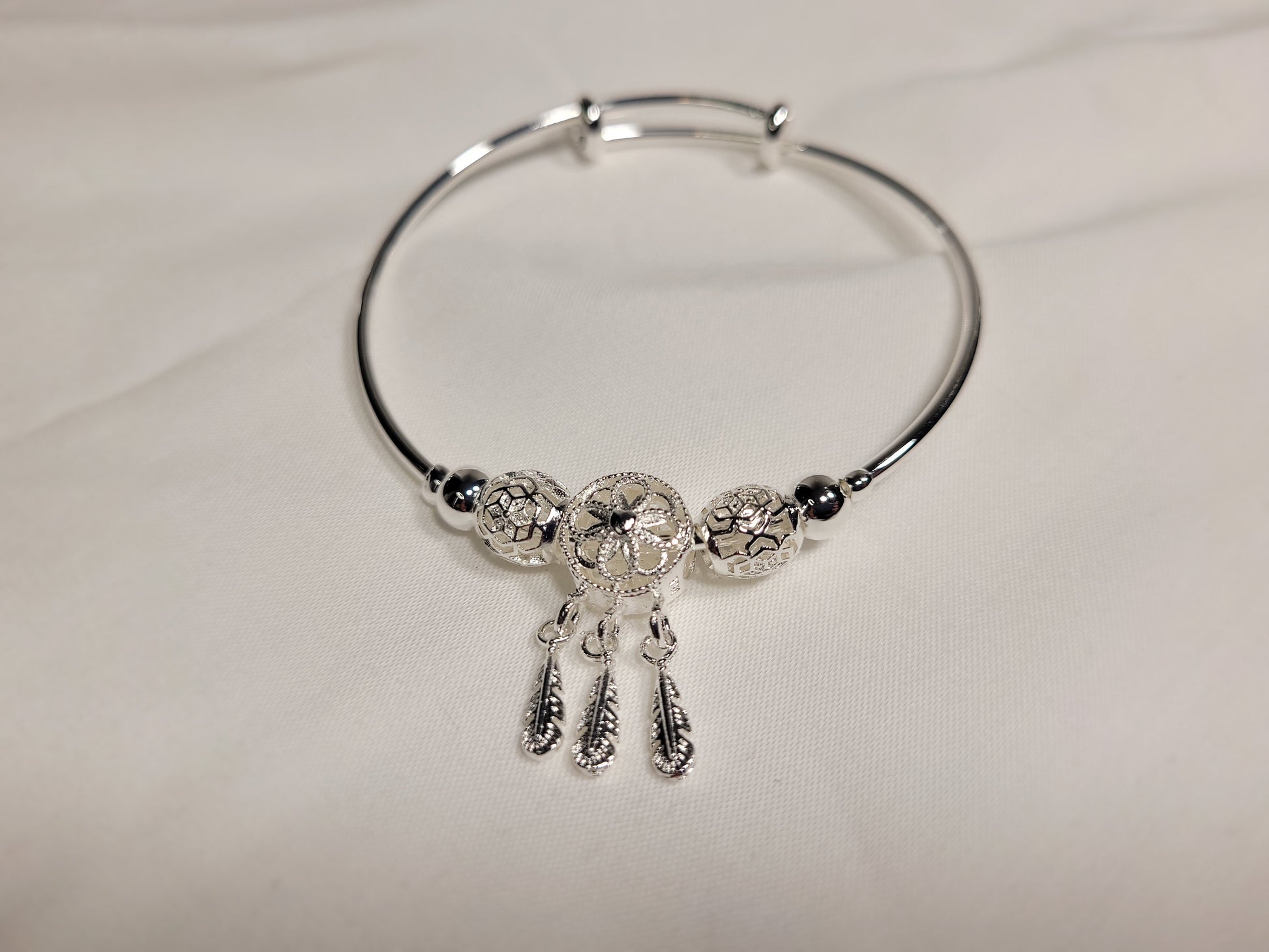 This brand new and high-quality hand bangle features a beautiful dream catcher design, crafted with intricate details and symbolism. Made from 925 sterling silver, it showcases the timeless beauty of this precious metal.