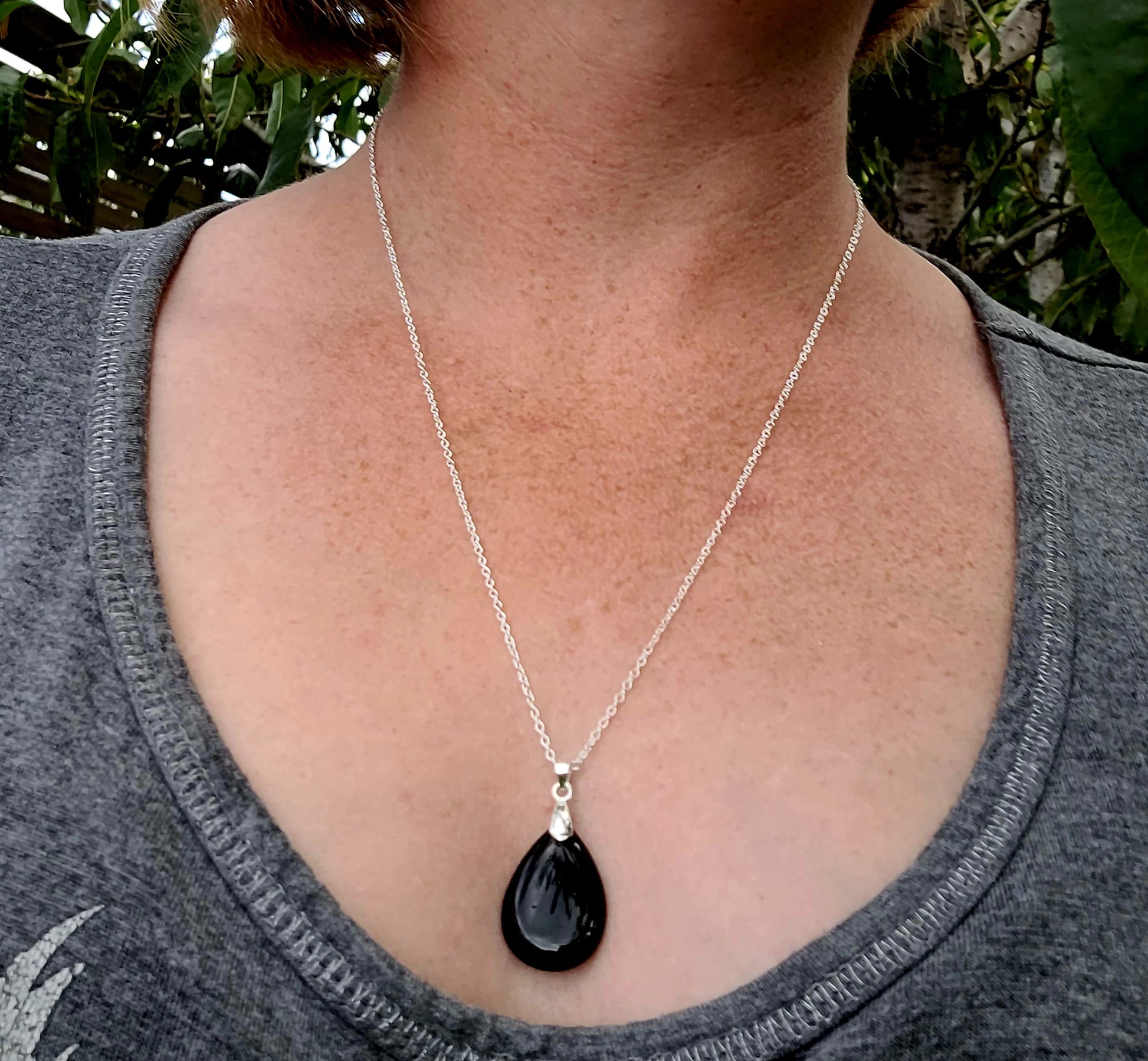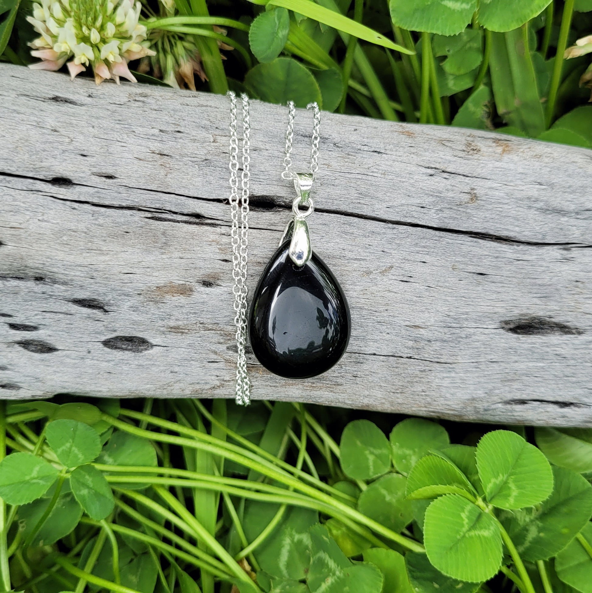 Crafted with precision, the obsidian pendant, measuring a nice 3 cm, is delicately suspended from a high-quality 925 silver chain, adding a touch of sophistication to every neckline. The deep, rich hue of obsidian, coupled with its teardrop silhouette, creates a captivating focal point that complements any outfit.