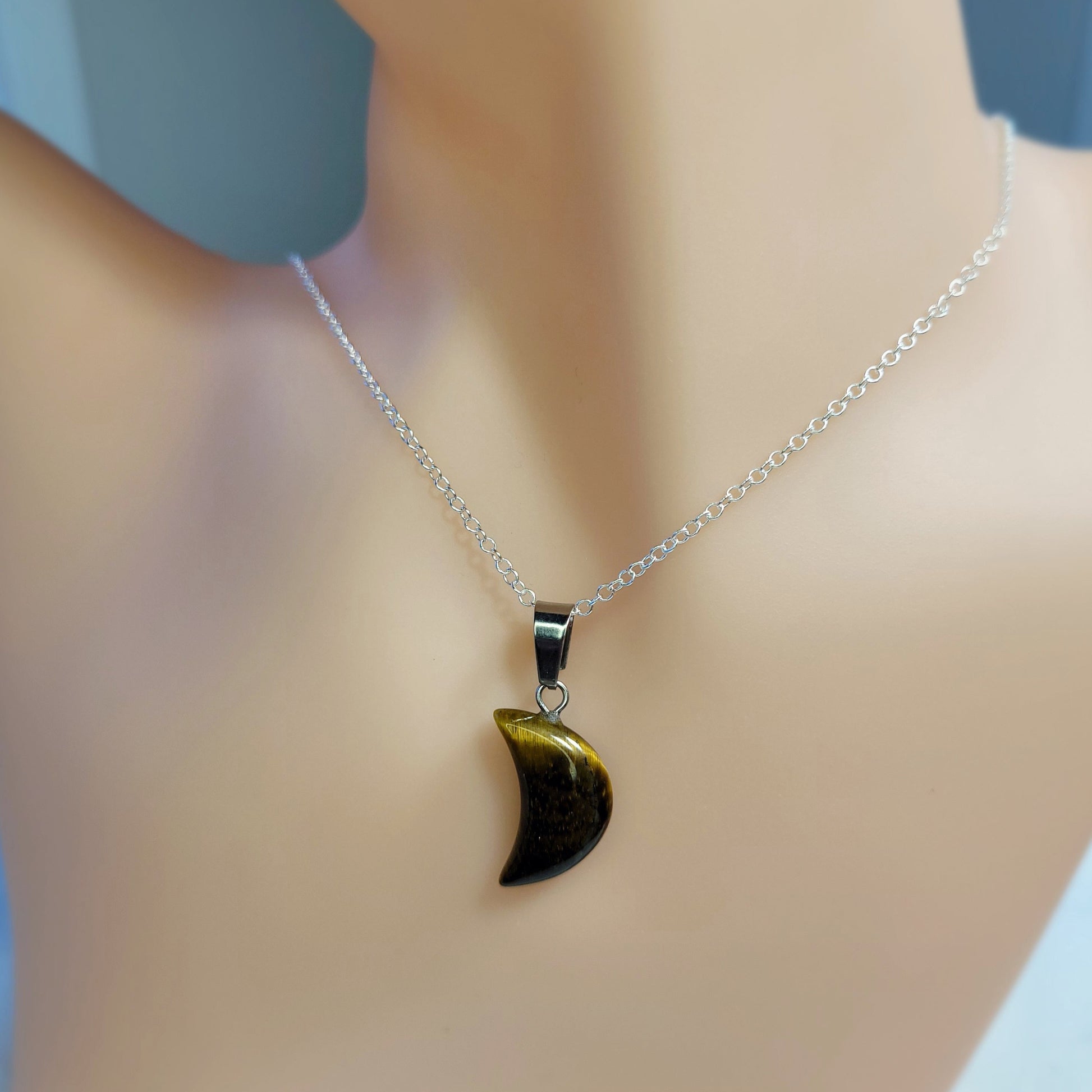 Introducing our exquisite Natural Tiger Eye Quarter Moon pendant, elegantly displayed on a sterling silver chain necklace. This captivating piece is designed to enhance your everyday style, adding a touch of sophistication and natural beauty to any outfit.